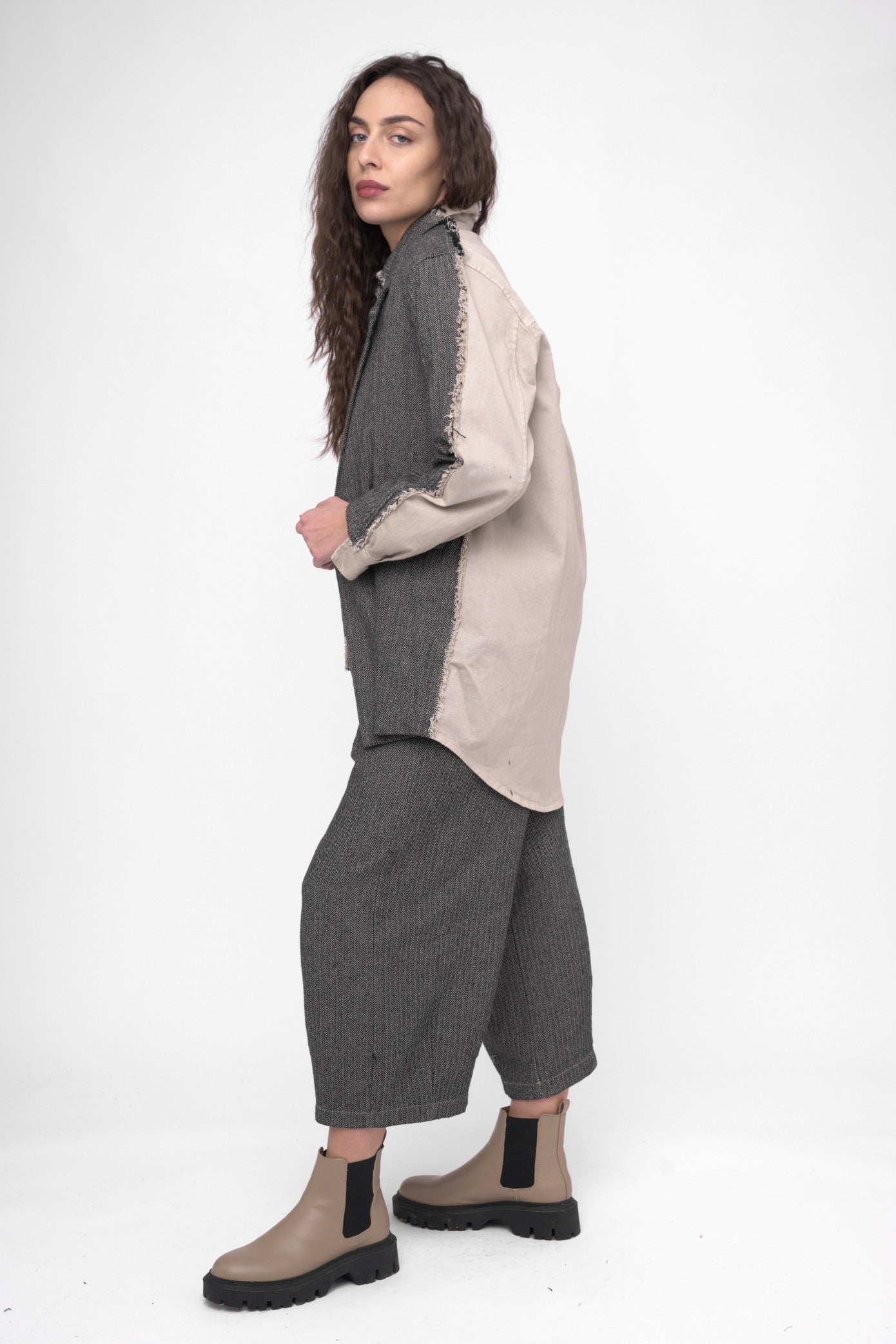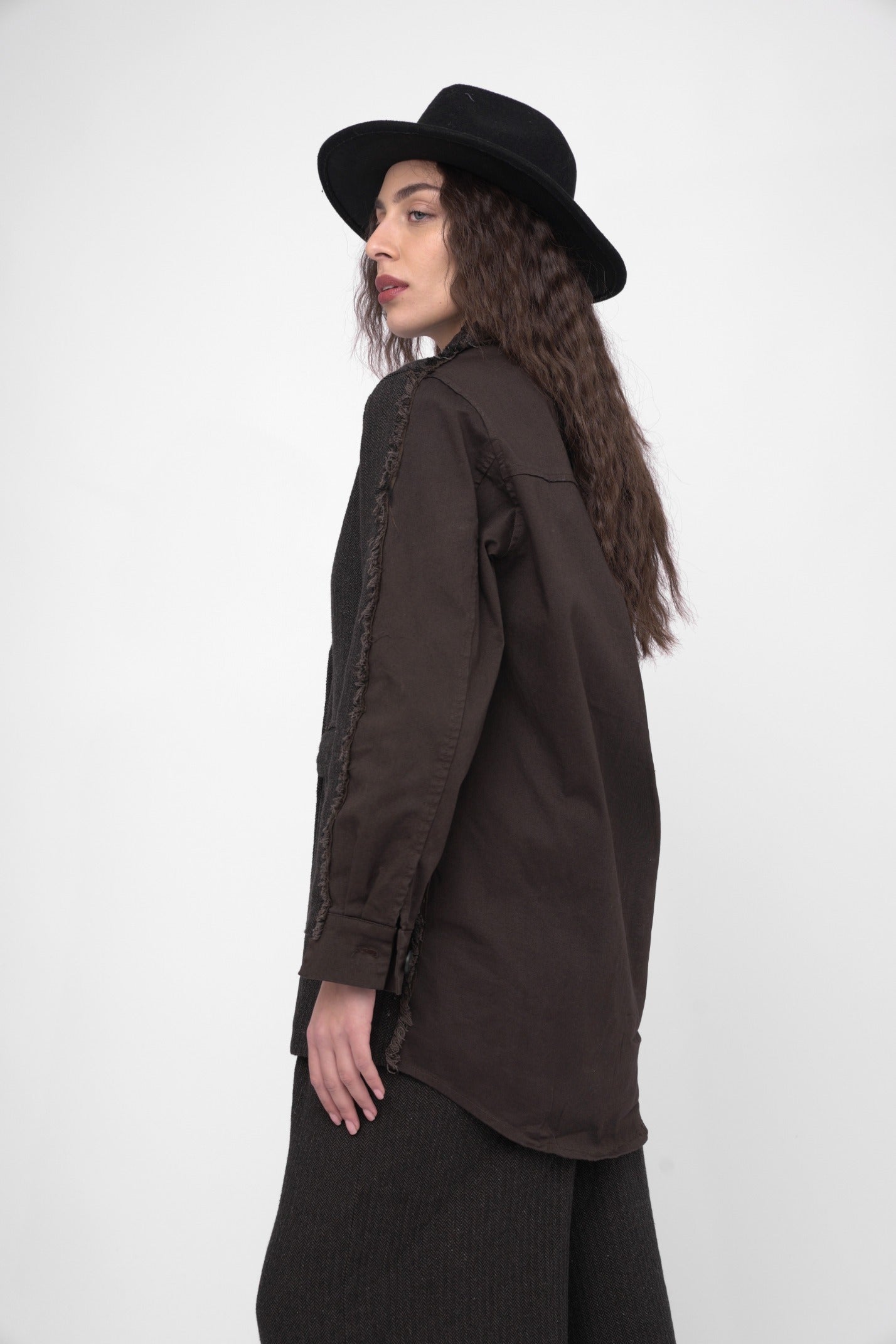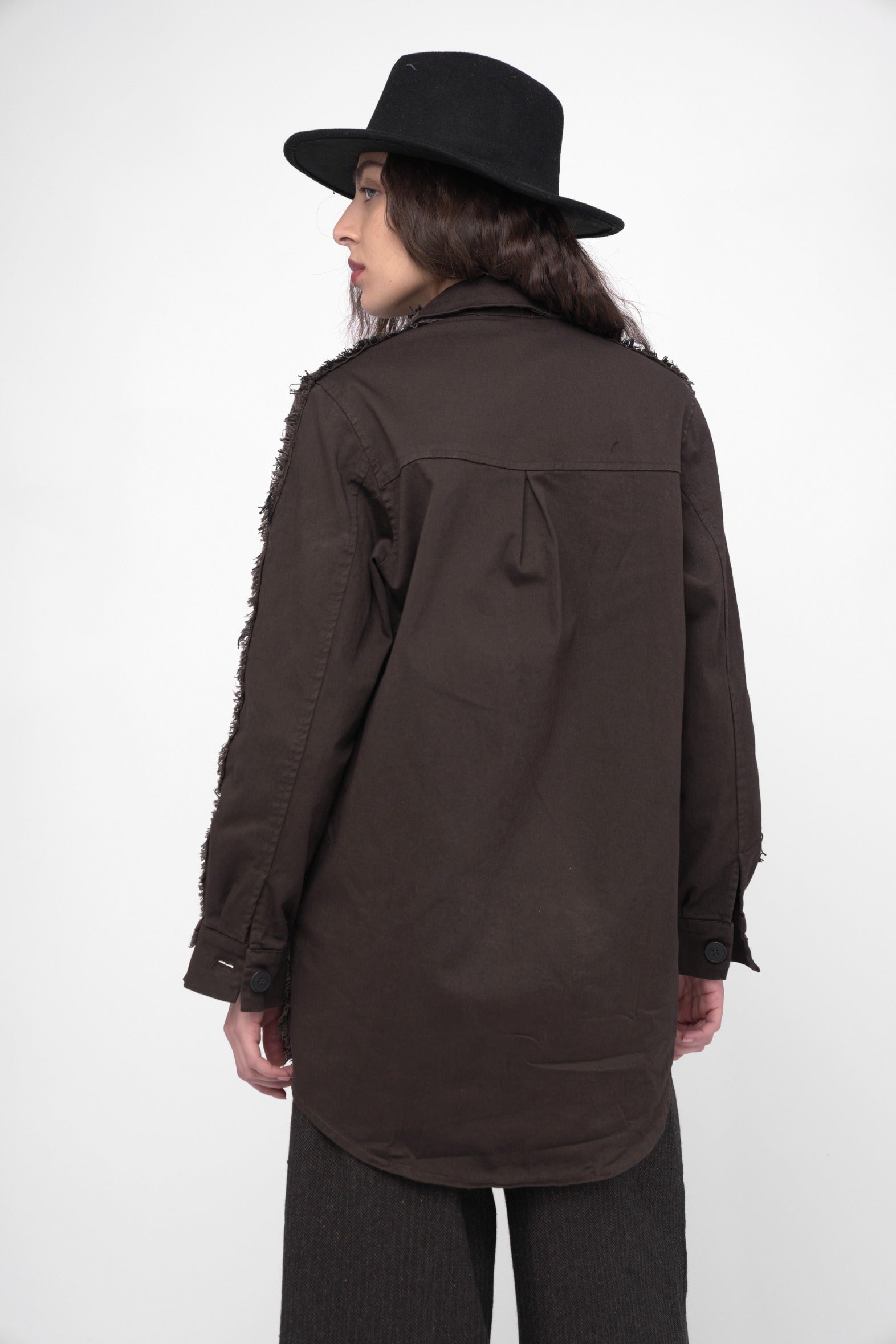 A masterpiece of style and craftsmanship, this blazer is meticulously designed with two contrasting materials and features a striking & intricate frayed detail that extends along the sleeves. Pair it with tailored trousers and a crisp blouse for a sophisticated and professional look. Dress it down with jeans and a simple top for a more casual yet chic outfit option.