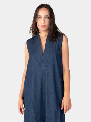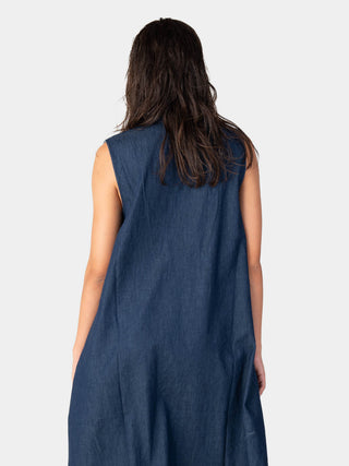 In this V-neck sleeveless denim midi dress, you will find a stylish and versatile piece of clothing that combines the casual and comfortable nature of cotton in denim, with the feminine and flattering silhouette of a midi dress. The combination of a V-neck, sleeveless design, denim fabric, and midi length can be dressed up or down. It is suitable for day outings, shopping trips, or even a casual day at the office. The choice of accessories such as a belt, a hat, or statement jewelry can only enhance the dress. For footwear we reccomend sandals for a casual look, or heels for a polished appearance.