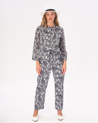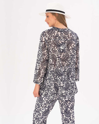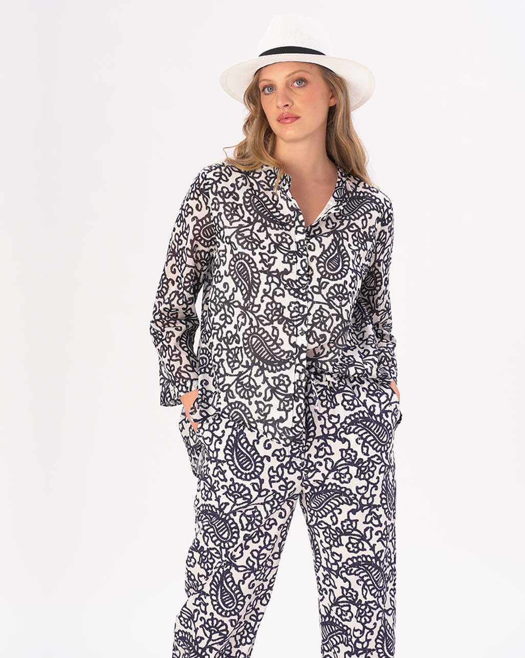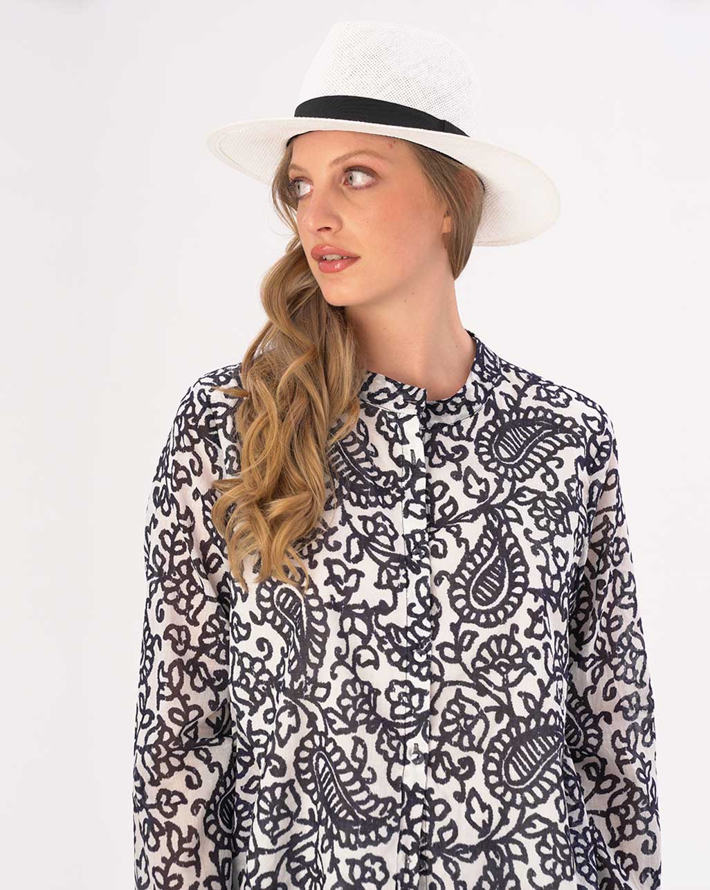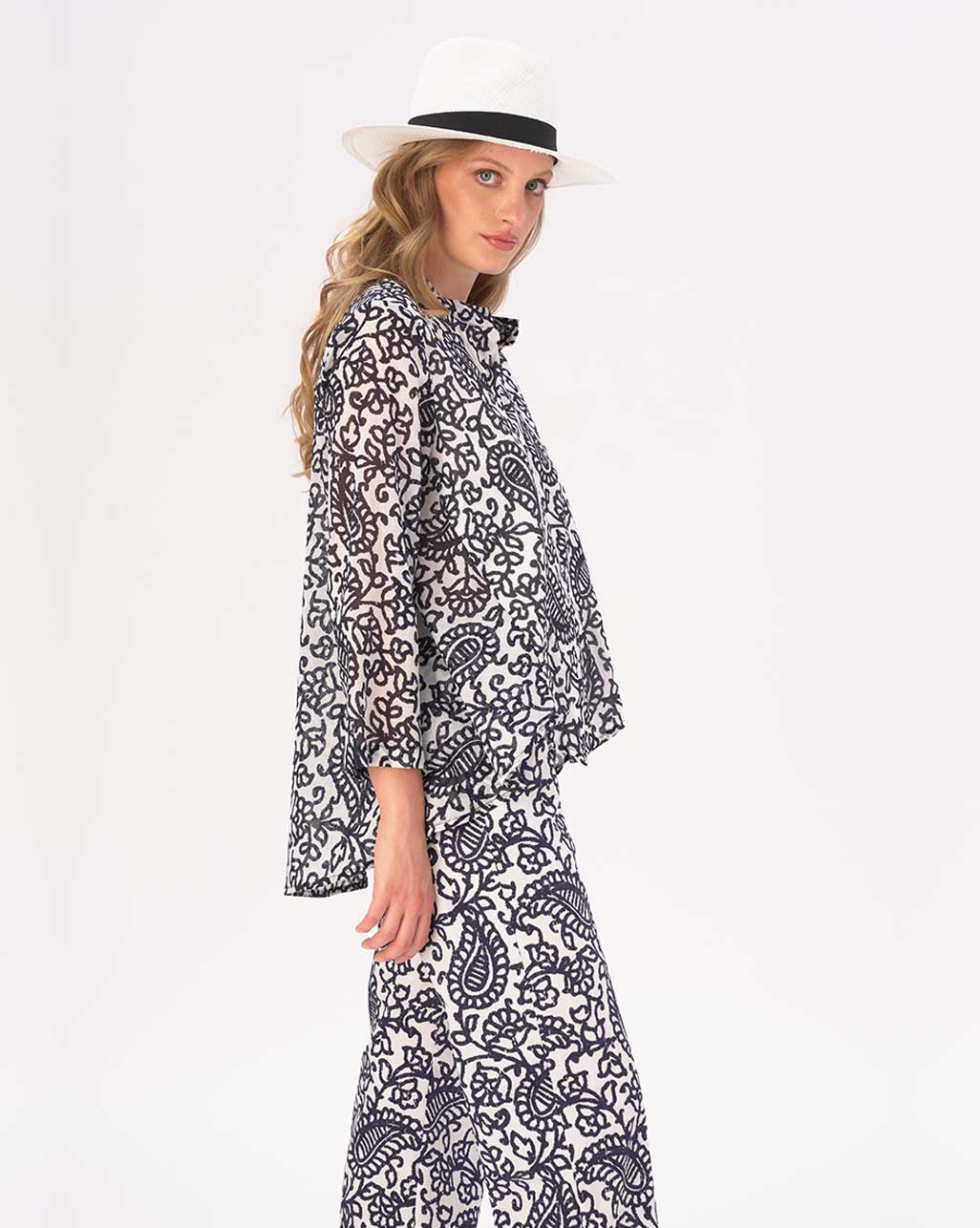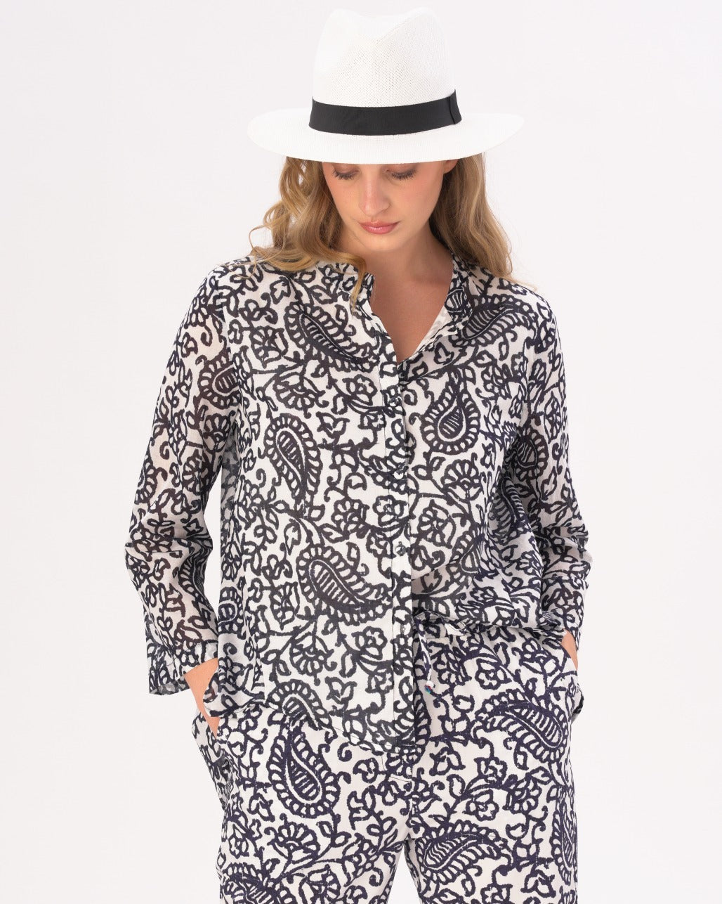 A classic cotton printed button down, light and flowy and perfect for the summer months with added details such as a banded collar, a high low hemline and a slightly cropped sleeve. A truly beautifully versatile top that can be used as a fun layering piece or be styled on its own for a bright yet classic vibe.