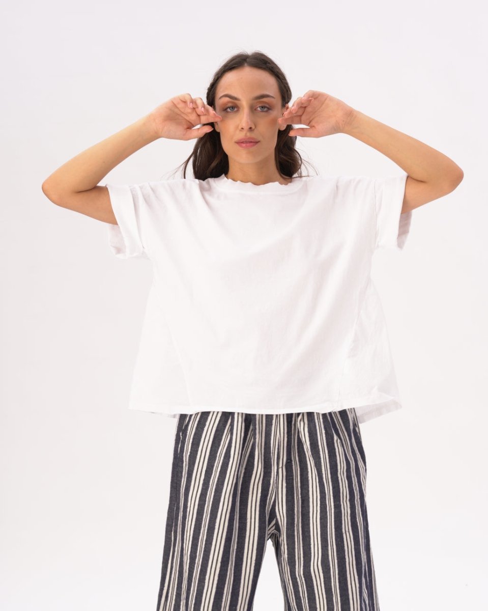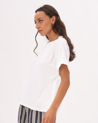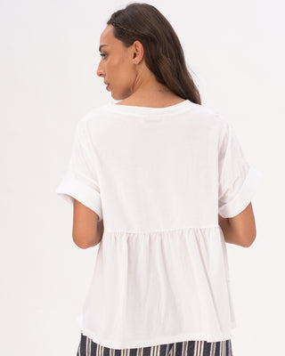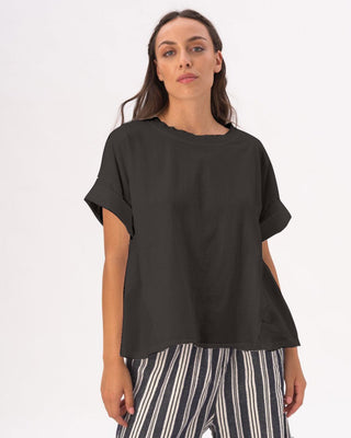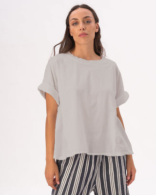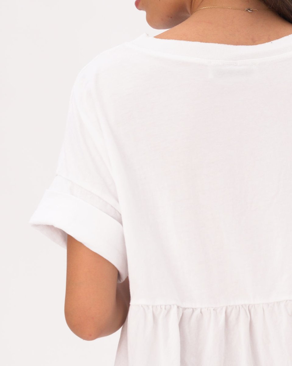 Simple yet chic, this staple tee with a rolled short sleeve adds a subtle detail to elevate any look. With details like a tiered back with a ruffle, and a loose fit, this top pairs elegantly with any slim fitting pant to create a balanced and simple look.