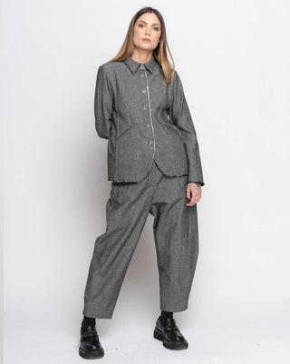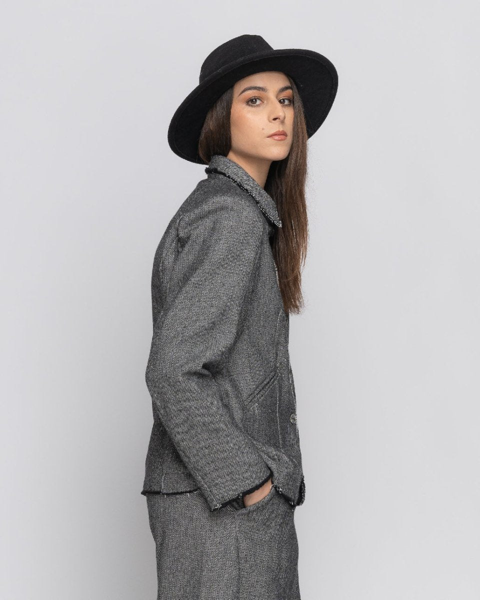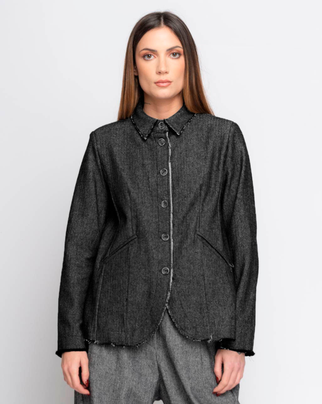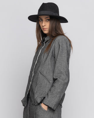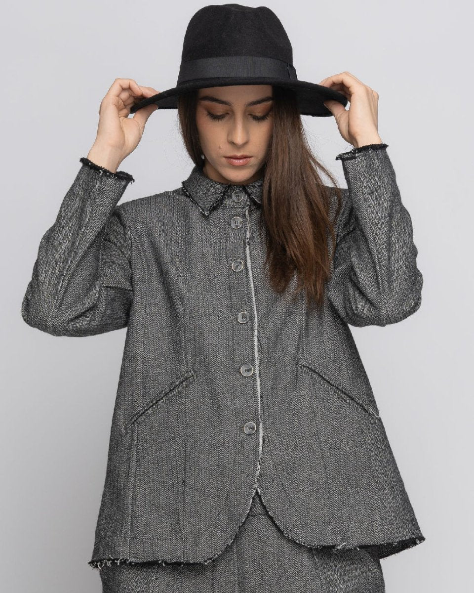 A sleek fit with a soft Herringbone fabric. Attention to detail in this light jacket is prevalent with raw edges. The back silhouette has a slight cinch in the waist giving a form pleasing look. The jacket worn by the model is a small, and the model is 5'8, with the hem hitting below her waist. The fit is loose around the bodice, and has a standard fitted sleeve.
